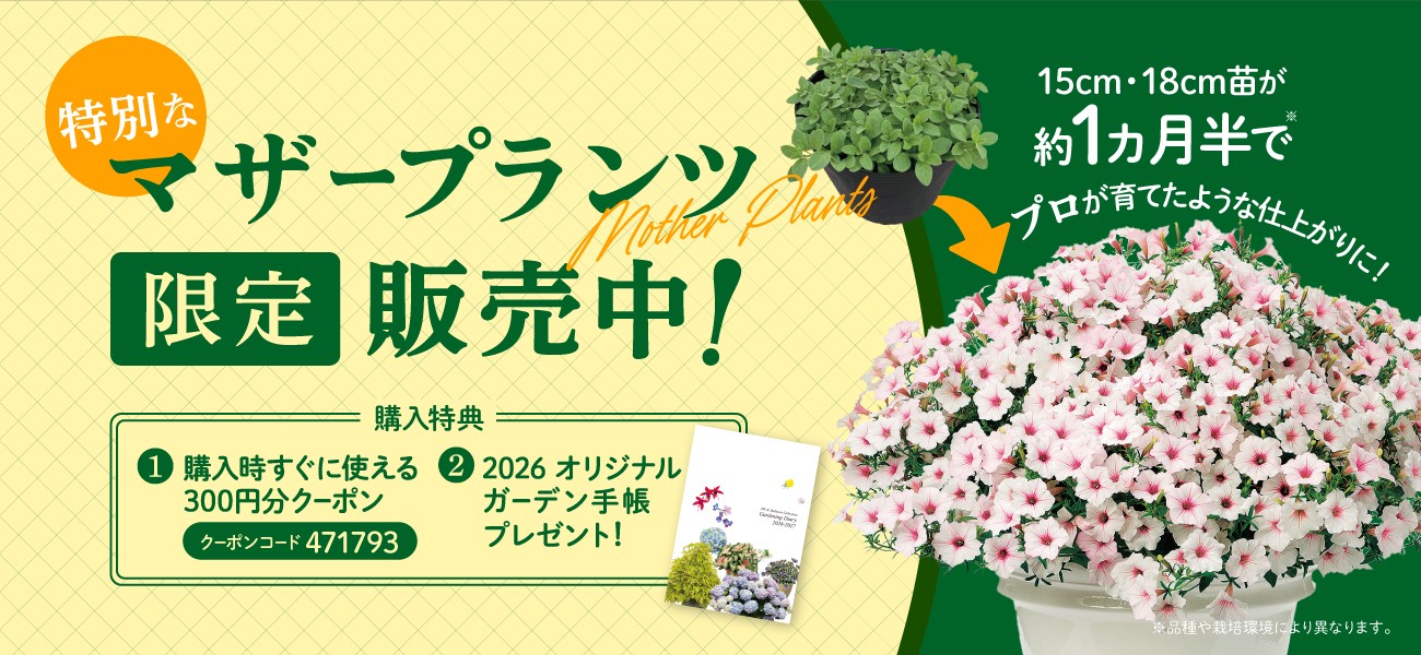 ¥1,430税込 限定販売 マザープランツ ピンチ済みだからこんもりとした株に! 【限定 マザープランツ】スーパーベナ(R) シュガーピンク 優しいピンクの花びらが広がり癒しの空間を庭やテラスに届けます! ¥1,430税込 【限定 マザープランツ】スーパーベル(R) レモンスライス まるでレモンをスライスしたような模様で、花がたくさんあるお庭の中でもひと際目を引き、夏も爽やかな印象! ¥1,100税込 【限定 マザープランツ】スーパーアリッサム スノープリンセス 人気のスノープリンセスのマザープランツです!花期が長くおすすめです! ¥1,430税込 【限定 マザープランツ】ステラ スノーストーム グレイシアブルー 日本の暑さ、蒸れに強く梅雨明け、秋雨後にも傷みにくく春から秋までたくさんの花を咲かせます! ¥1,430税込 限定商品 数量限定で販売しています。在庫残りわずかです! 【SALE】【送料込】HAPPY BAG 3,300円 通常価格合計5,500円(税込)のところ、【送料込】でなんと3,300円(税込)! ¥3,300税込 【SALE】【送料込】HAPPY BAG 5,500円 通常価格合計10,120円(税込)~のところ、【送料込】でなんと5,500円(税込)! ¥5,500円税込 秋おすすめの花苗!シクラメン 秋から春まで長く、華やかに彩る!人気のミニシクラメン!寄せ植えにもおすすめ!