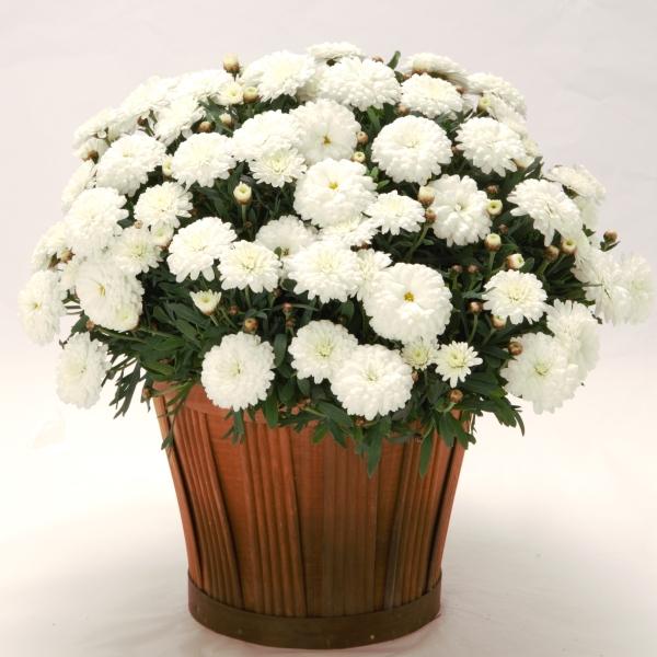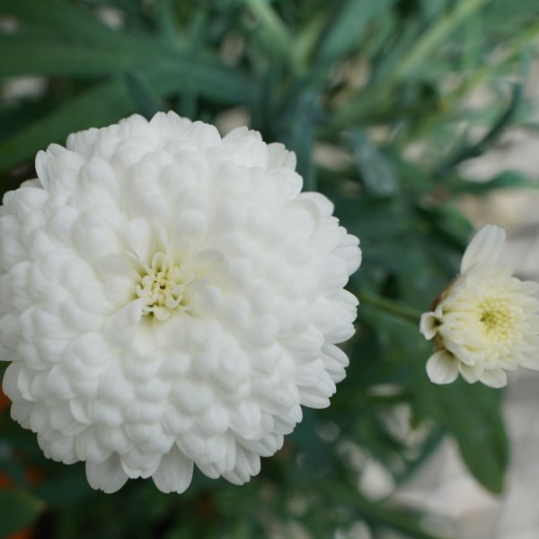 マーガレット シュガリースフレは、分枝性に優れた八重咲きマーガレットで、純白でボリュームある花を咲かせます。ポンポン咲きのスフレのようなふんわりと柔らかいイメージの花を咲かせます。