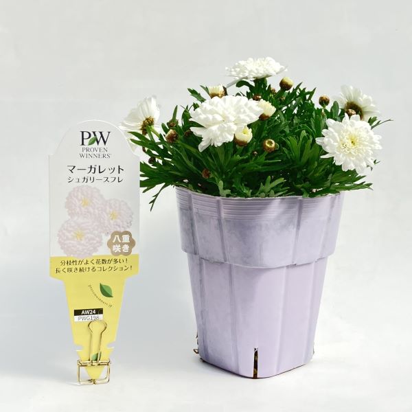 PWのマーガレットは、従来のマーガレットよりよく枝分かれし、連続開花性がアップしたマーガレットです。1株で株いっぱいに花を咲かせます。