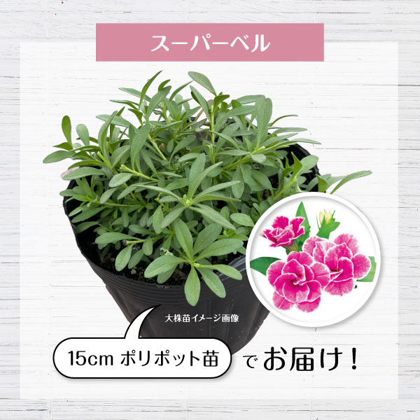 ハンギング,プランター/鉢植え,花壇/地植え <植えつけ>1ポット当たり24cm鉢前後、プランターは2~3ポット、花壇は20cm~40cm間隔が目安。 | 管理のポイント | 〈花の色・模様について〉栽培時の環境により色・模様が異なる場合があります。肥料切れしないように、欠かさず肥料を与えてください。植え込み後、鉢からはみだした枝を摘むと株にボリュームがでて上手に仕立てられます。満開になった後は伸びた部分を切り戻し、追肥を与えると長い間楽しめます。 |