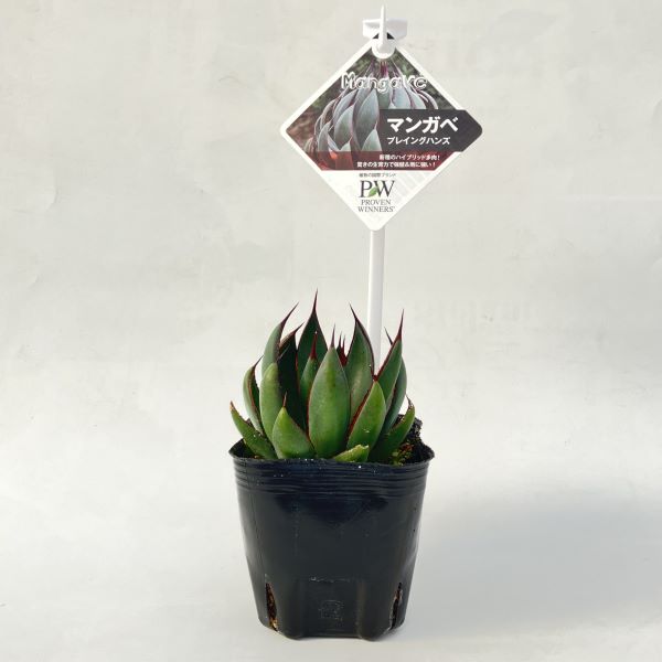 ※マンガベは、マンフレダとアガベの交雑によって誕生した新ジャンルのハイブリッド多肉植物です。生育旺盛ですが、育てる鉢により小さいままで育てることもできます。特徴的な模様で、日照や温度によって色の変化が楽しめます。また、雨に強く花苗感覚で初心者の方にもカンタンに育てやすいです。