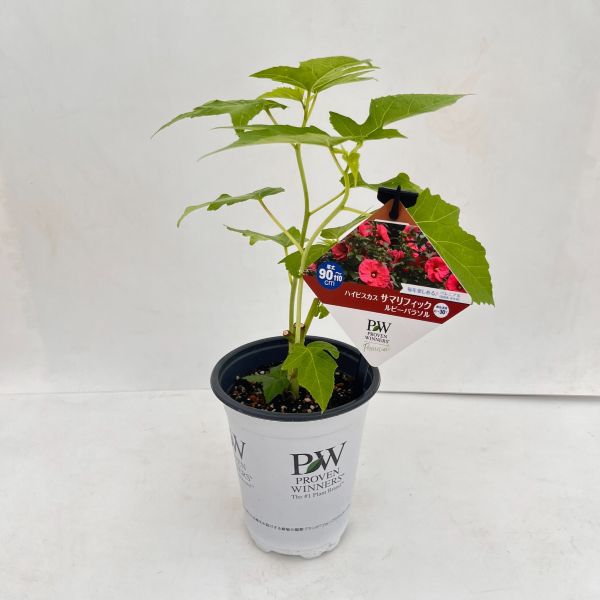 ハイビスカス サマリフィック ルビーパラソルは、他の2品種よりもコンパクトな宿根ハイビスカスです。