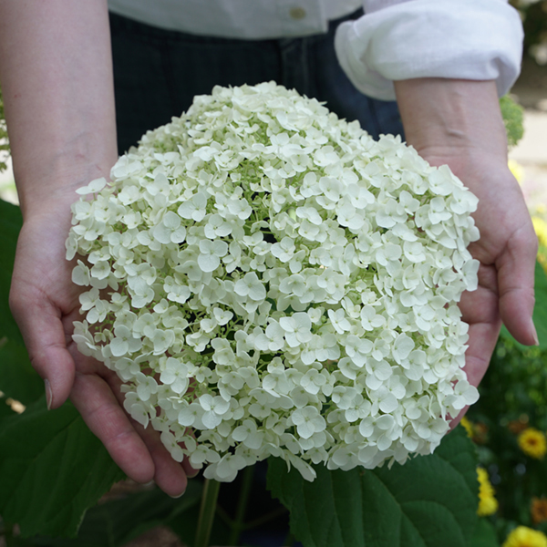 直径30cmもある花房がたわわにつくアナベル グランデ クリーム。咲きははじめは緑色の花が、やがて白色に変わりバスケットボールぐらいの大きさの大きなスノーボールになります。その後ヒスイのような美しい淡い緑色と変わり、そのまま霜が降りる頃まで長く花を楽しめるのが魅力です。白いアジサイは夏の直射日光で変色してしまうものもありますが、アナベル グランデ クリームは日なたでも日焼けしにくいです。