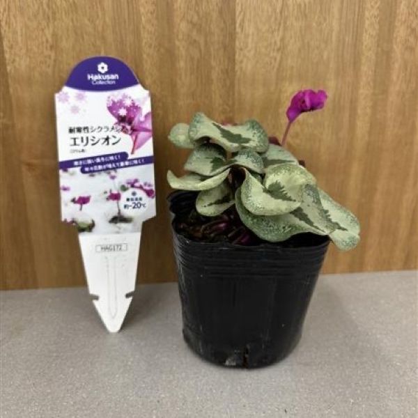 シクラメン エリシオンは、コウム系の品種で、冬咲きで小型。丸い葉と可憐な花が特徴です。