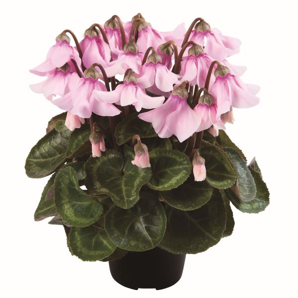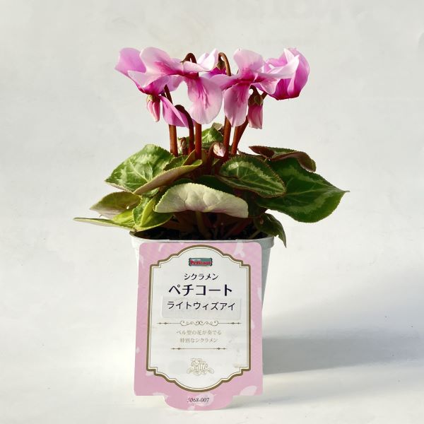 ベル型のペチコートをはいたような華やかな花を咲かせる下向きに咲くシクラメンです。下から覗いて、花弁内側の模様も楽しんでみてください。シクラメン ペチコート ライトウィズアイは、花弁の内側の模様が際立つホワイトベースのシクラメンです