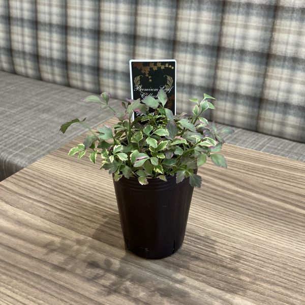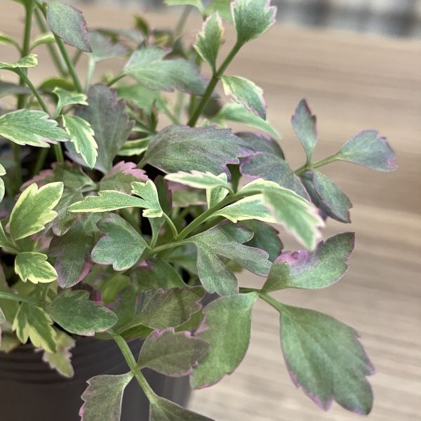 ピンクがかった斑入りの葉と、美しい切れ込みのある繊細な葉姿が特徴で、花壇や寄せ植えの草花を引き立てるカラーリーフとして重宝します。
