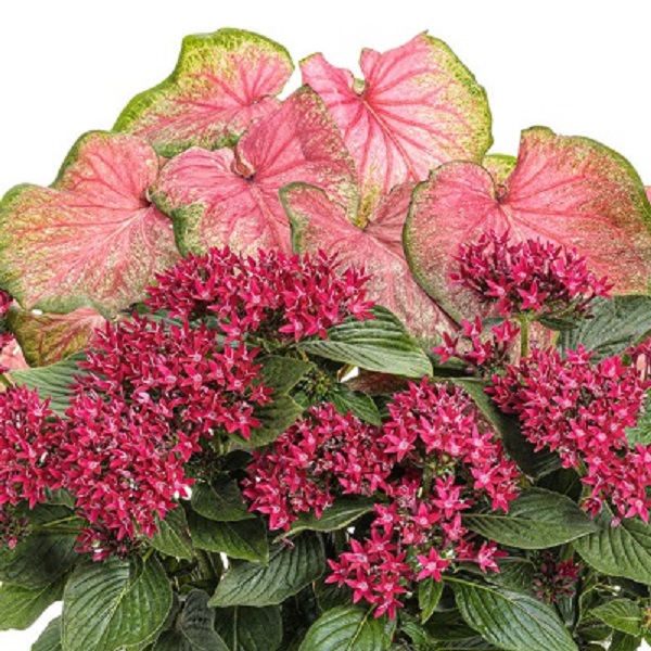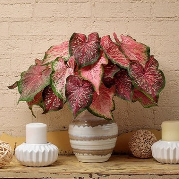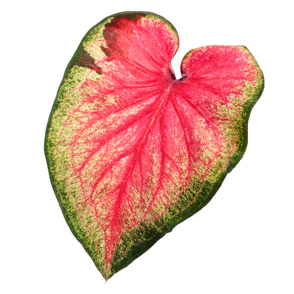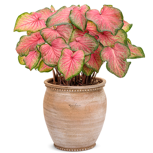 1枚の葉が10〜15cmと大きめで、ハート型の葉をたくさん茂らすカラジウムです。日本の高温多湿の気候でも育てやすく、直射日光があたる場所から半日陰、日陰でも育てることができます。色がなかなか出せない真夏のシェードガーデンをカラフルに仕上げることも可能です。