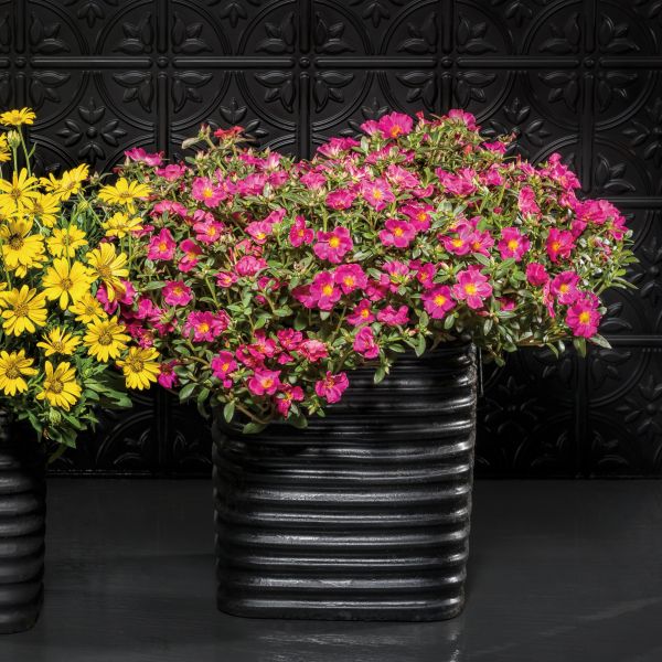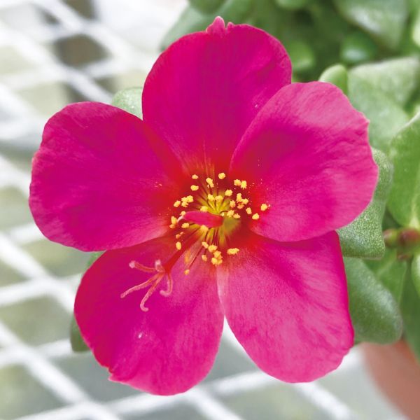 ポーチュラカ サマージュエル ネオンピンクは、シルキーな光沢のあるハート形の花弁がかわいい品種です。花の大きさは約5cmと一般的なポーチュラカよりも大きめで、半立ち性なのでボリュームも出しやすく寄せ植えに使っていただくこともできます。耐暑性、耐乾性に優れた大変強い品種です。