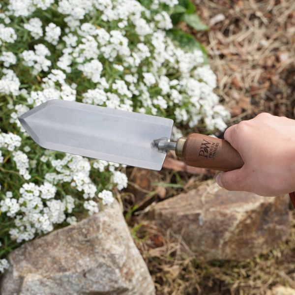 ハンドトロウェルは、球根や苗の植え付け時の穴掘り、根切り作業などに適した、刃幅の細い移植ごてです。細幅で両サイドに刃が付いているので、地面に対する抵抗が少なく、穴掘りに適しています。