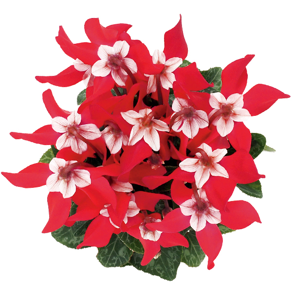 花弁と白く整った萼(がく)とのコントラストが印象的なシクラメン ジックス。連続開花性に優れ、次々と花が上がり、花もちがよく、観賞期間が長いのが嬉しいシクラメンです。