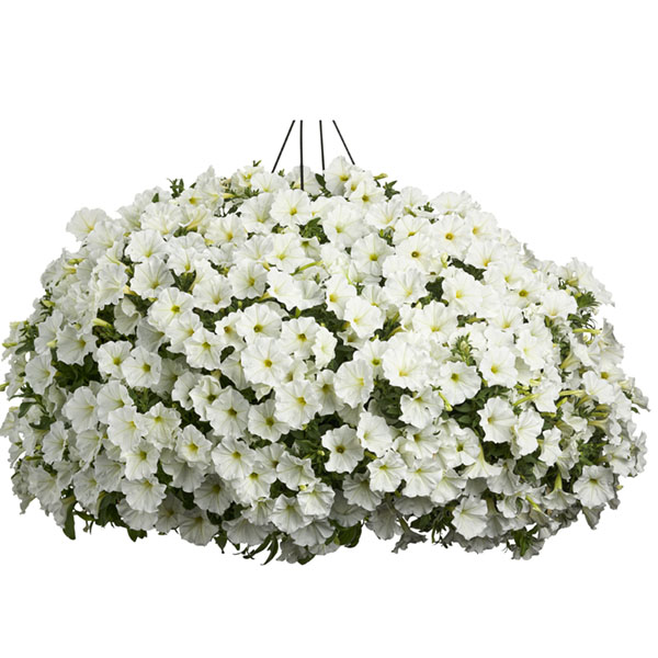 スーパーチュニア ビスタ スノーは、中心部が淡い黄色のホワイトカラーの花が次々に咲きます。