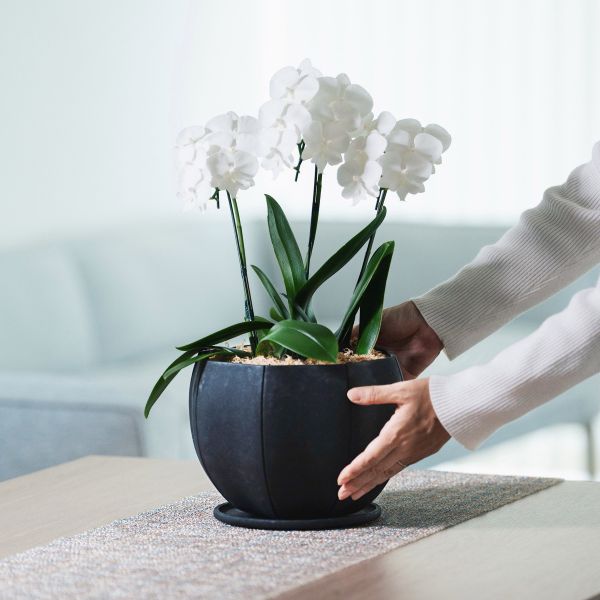シンプルでフラットなデザインが鉢のフォルムを引き立て、空間に洗練された印象を添えます。