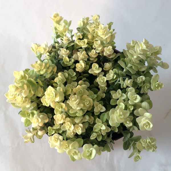 ヘリクリサム ライムミニは、同じヘリクリサムでも小さな丸葉のライム色が密に重なる可愛らしいタイプで、鉢の縁からふんわり垂らしたり、浅鉢に広げて「マット」状に仕立てると映えます。