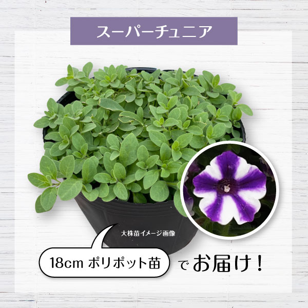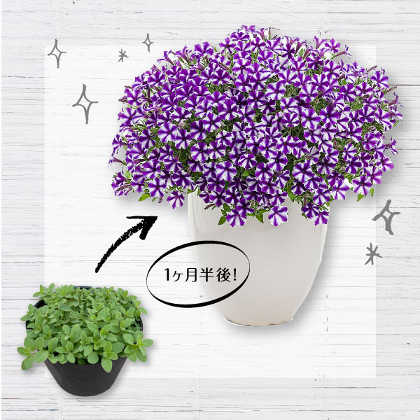 ハンギング,プランター/鉢植え,花壇/地植え <植えつけ>1ポット当たり30cm鉢前後、プランターは2~3ポット、花壇は30cm~50cm間隔が目安。 | 管理のポイント | 〈花の色・模様について〉栽培時の環境により色・模様が異なる場合があります。肥料切れしないように、欠かさず肥料を与えてください。植え込み後、鉢からはみだした枝を摘むと株にボリュームがでて上手に仕立てられます。満開になった後は伸びた部分を切り戻し、追肥を与えると長い間楽しめます。 |