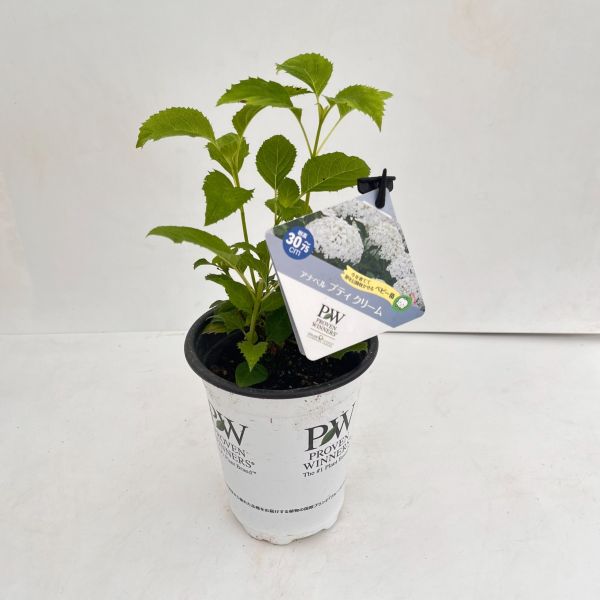 アナベル プティ クリームは、アナベルの中で最もコンパクトな品種のひとつです。白色の花色は成長するにつれて、薄緑色や薄桃色のコンビネーションカラーとなります。