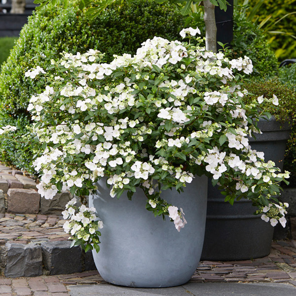 ハンギング,プランター/鉢植え,花壇/地植え | 管理のポイント | 培養土はアジサイ用または草花用がおすすめです。初秋までは充分に肥料を与えると葉色が濃くなり、花が大きくなります。また栄養状態がよくなり翌年立派な株に生長します。しだれるような樹形を楽しむ場合は、剪定は基本的に必要ありません。樹形を整える場合は晩夏まで伸びた枝を剪定します。霜や寒風で花芽が傷むことがあります。特に寒冷地で栽培する場合は、低温時は軒下など寒風や強い霜が直接あたるのを避けた場所で管理すると株が傷みにくいです。ー5℃以下の低温にあたりつづけると、春に展開する葉の一部がよじれる場合があります。誤って口にすると中毒症状を起こす可能性がありますので、扱う際には十分注意してください。 |