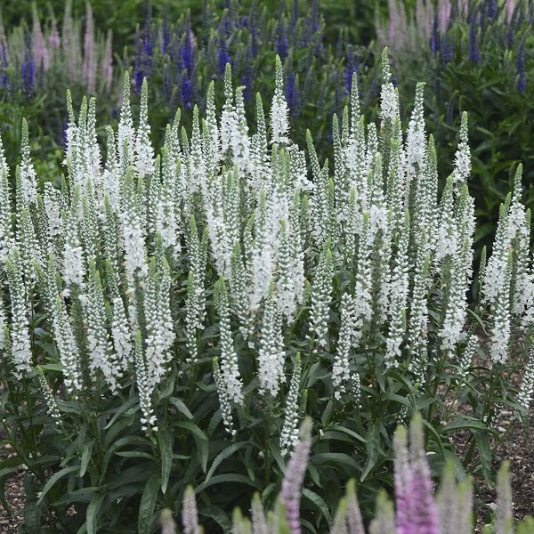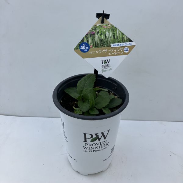 ベロニカ ウィザーディングは、生育旺盛で、枝数たくさんのこんもりとしたボリュームのある株に育ち、花茎がたくさん上がります。ベロニカ ウィザーディング ホワイトワンズは連続開花性に優れ初夏から秋まで次々にナチュラルな純白の花を穂状に咲かせます。