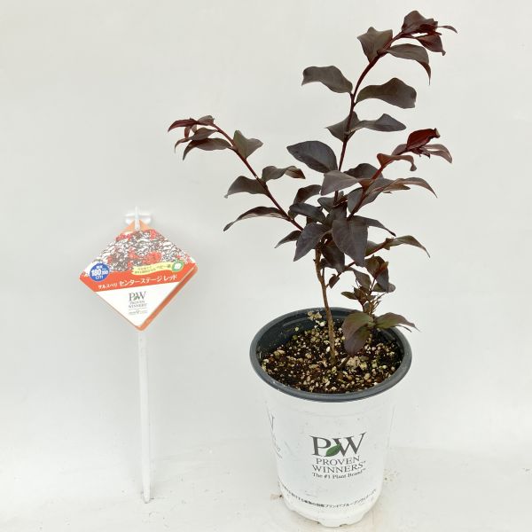 サルスベリ センターステージ レッドは、鮮やかな赤色と光沢ある濃紫色の葉のコントラストが魅力的なサルスベリです。