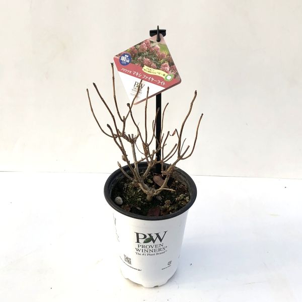 ノリウツギ マキシ ファイヤーライトは、大きな円錐形の花序が株いっぱいにつく、存在感抜群のノリウツギです。花色が乳白色から晩夏には鮮やかなピンク色へ、さらに秋にはザクロのような深みのある鮮やかな赤色に変化し、長い間庭を美しく彩ります。耐寒性に優れ、日本全国で冬越し可能です。