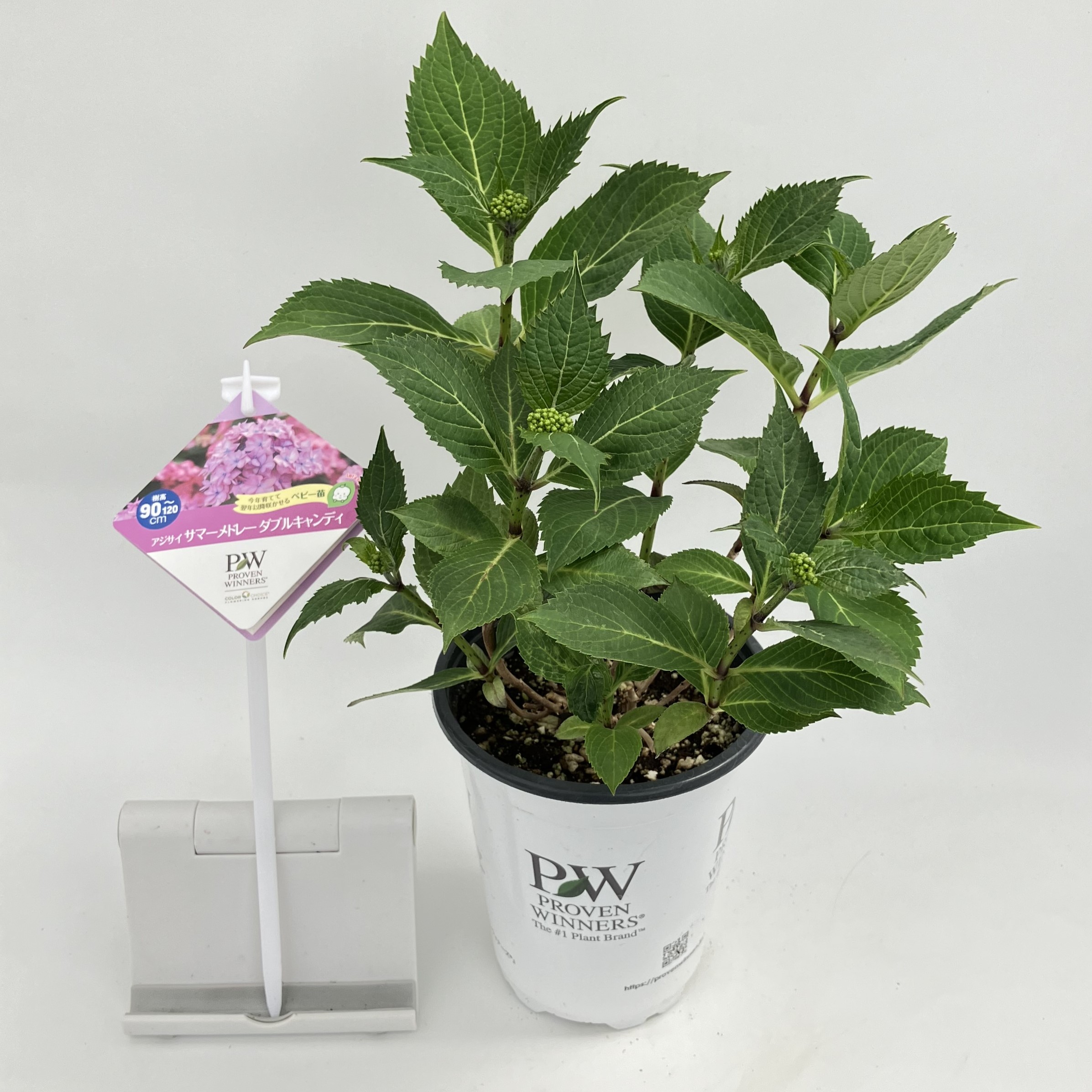 アジサイ サマーメドレー ダブルキャンディの魅力は、一目惚れしてしまうような美しい花を咲かせるだけではありません。花が枝の先端だけでなく、枝の側芽からも咲く特性を持ち、株いっぱいに咲き誇ります。万が一冬の寒さで先端の花芽が枯れてしまっても残りの花芽が開くため、毎年花を楽しみやすいアジサイです。また、新旧両枝咲きで繰り返し花が楽しめるのも魅力です。剪定しなくてもコンパクトにまとまり管理がラクです。
