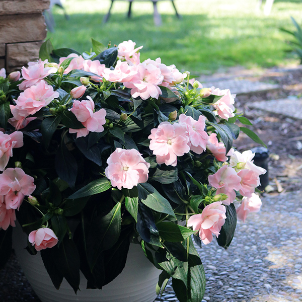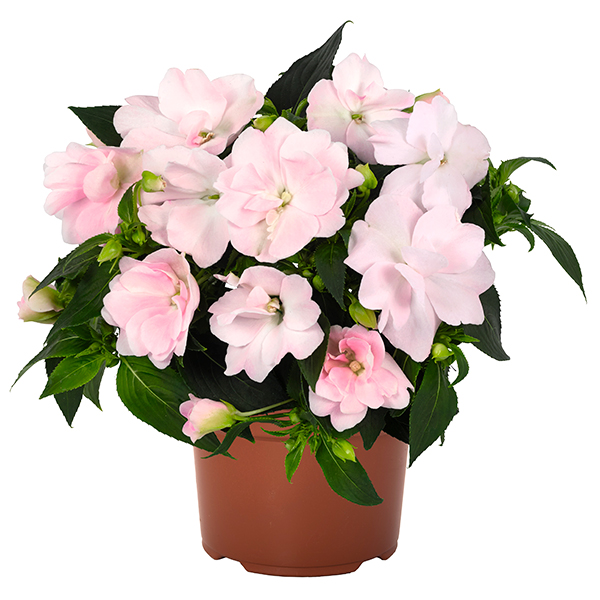 ニューギニアインパチェンス ワイルドロマンスは、折り重なる表情豊かな八重咲きのニューギニアインパチェンスです。分枝性がよくボリュームある株に生育します。