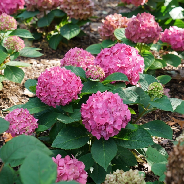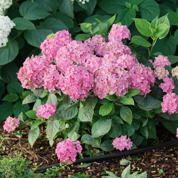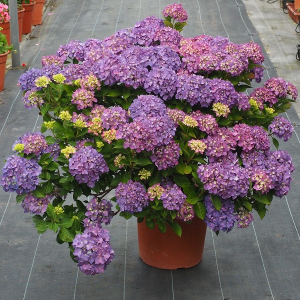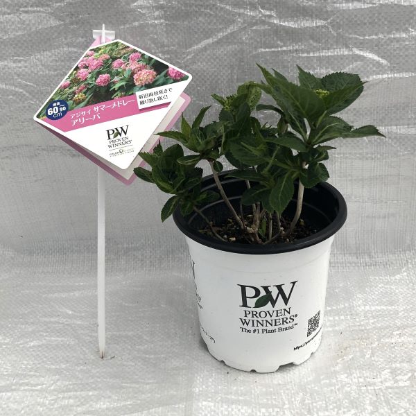 アジサイ サマーメドレー アリーバは、アジサイ サマーメドレー アリーバは、枝の先端だけでなく側芽からも花が咲き、株いっぱいにたくさんの花を咲かせるアジサイです。また、新旧両枝咲きで繰り返し花が楽しめるのも魅力です。花の色は土壌のpHによって変わりますが、土壌の性質に関係なく鮮やかな色が期待できます。剪定しなくてもコンパクトにまとまり維持管理がラクです。
