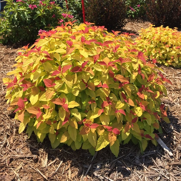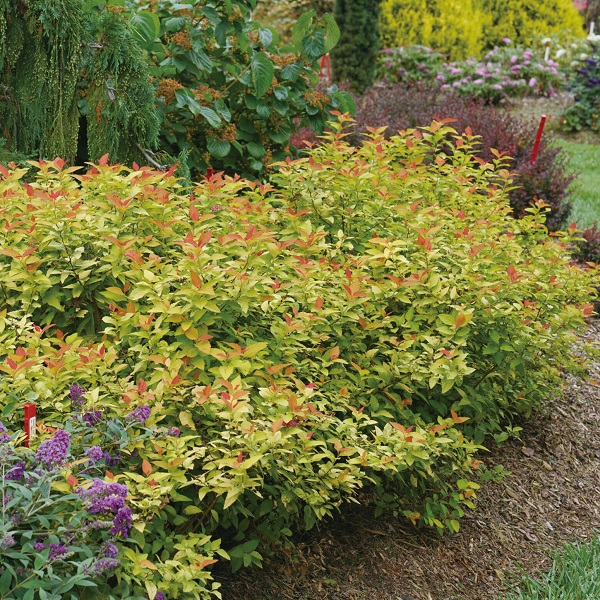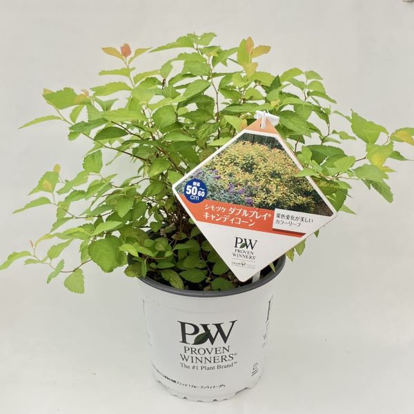シモツケ ダブルプレイ キャンディコーンは、晩春から初夏にかけて咲く綿毛のような濃い紫色の花が美しく、一年中明るいオレンジ色の葉を楽しめます。