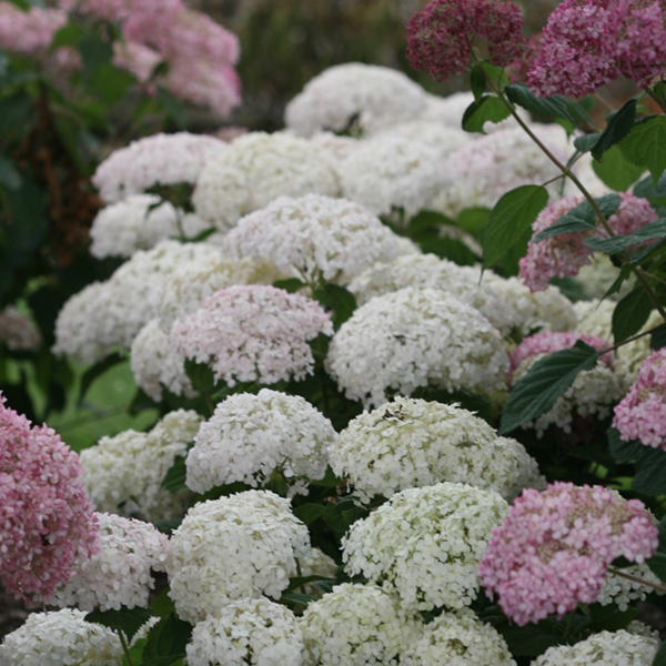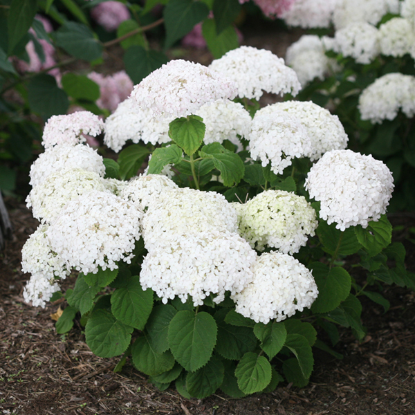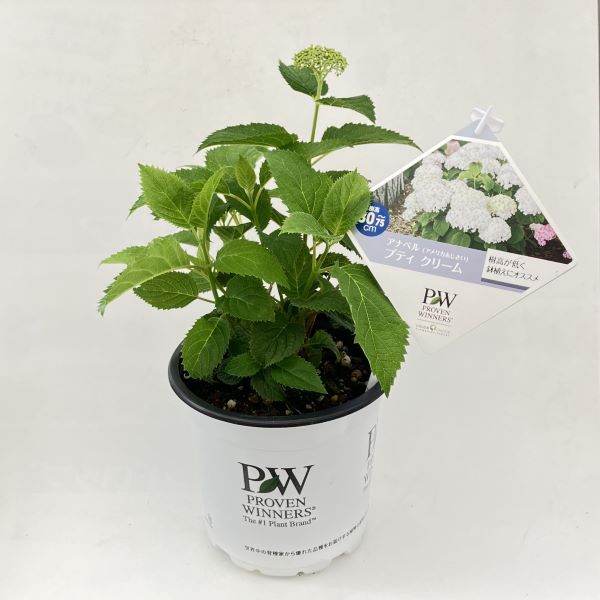 アナベル プティ クリームは、アナベル(アメリカあじさい)の中で最もコンパクトな品種です。白色の花色は成長するにつれて、薄緑色や薄桃色のコンビネーションカラーとなります。白いアジサイは夏の直射日光で変色してしまうものもありますが、アナベル プティ クリームは日なたで育てても日焼けしにくいです。