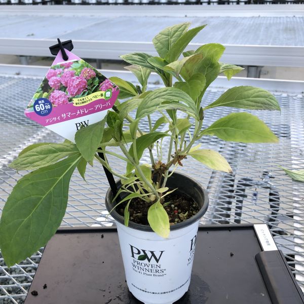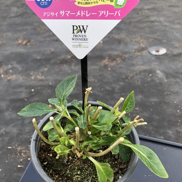 アジサイ サマーメドレー アリーバは、枝の先端だけでなく側芽からも花が咲き、株いっぱいにたくさんの花を咲かせるアジサイです。また、新旧両枝咲きで繰り返し花が楽しめるのも魅力です。花の色は土壌のpHによって変わりますが、土壌の性質に関係なく鮮やかな色が期待できます。剪定しなくてもコンパクトにまとまり維持管理がラクです。
