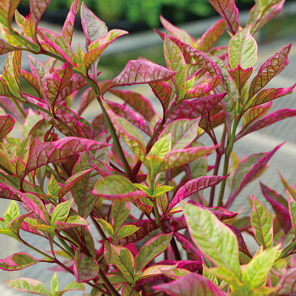 ピンク色に輝くトリカラーが美しいカラーリーフは、春から夏の間は斑入り葉も楽しめ、表情豊かに葉色を変えていく美しい品種です。よく枝分かれし枝がまっすぐ育ち、立ち性の樹形となります。
